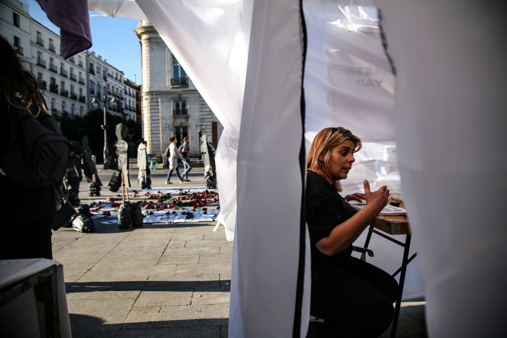 A Madrid, 10 femmes ont entamé le 6 mai leur deuxième grève de la faim. Un jeûne solidaire pour réclamer protection pour les victimes de la violence machiste. Une mobilisation qui vise à interpeler politiques et citoyens sur l’urgence d’agir. Depuis janvier 2017, 24 femmes sont mortes après des violences domestiques. Le photographe Samuel Bregolin a passé plusieurs jours aux côtés des femmes de l’association Velaluz sur la Puerta del Sol, en plein cœur de la capitale.